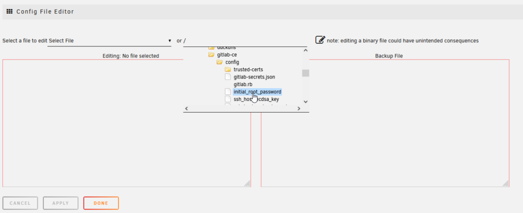 Gelukkig had ik de Config File Editor plugin ge茂nstalleerd en kon ik zoeken naar de gitlab -ce config folder: