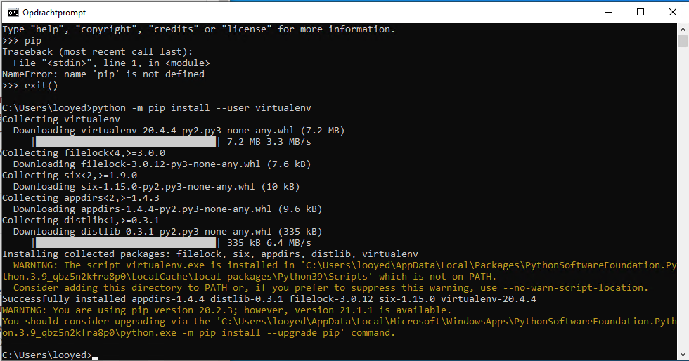 Bij de installatie wordt een voorbeeld gegeven dat een ander onderdeel: virtualenv ook moet worden geinstalleerd.
