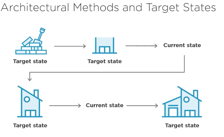 Als er wijzigingen plaatsvinden, dan kan dat ook via de enterprise architectuur. De beschrijving in documenten om te komen van de huidige naar de doel architectuur.